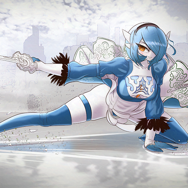 Gardevoir sliding across a shallow watery plain; dressed like 2B from Nier Automata. Two Variations, both green and blue.